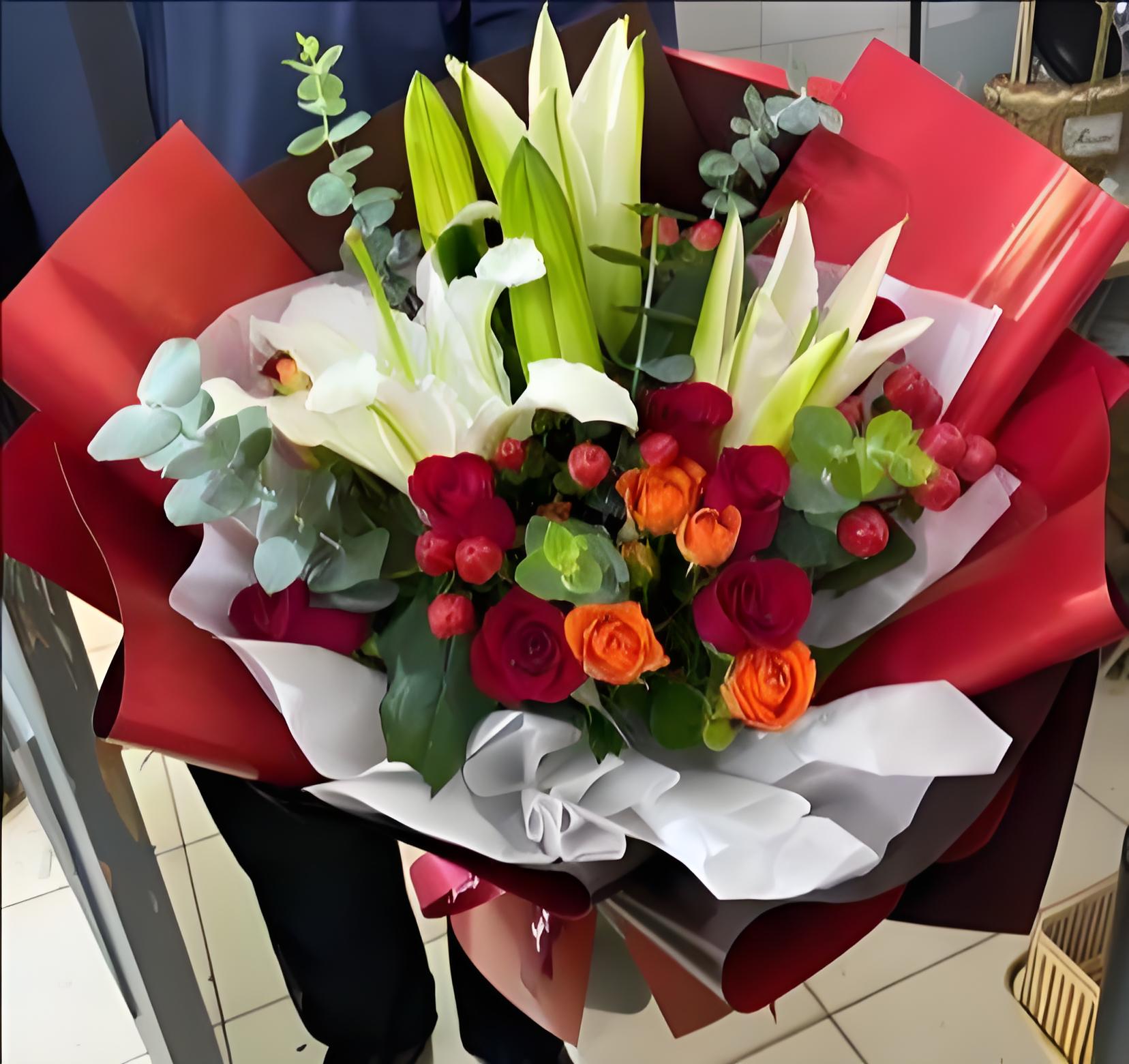 佛山顺德区花店包11枝红玫瑰、2枝多头白百合、6枝橙色多头玫瑰、红豆、尤加利叶